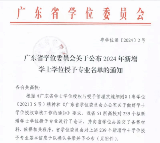 近日,根据广东省学位委员会公布的《广东省学位委员会关于公布2024年新增学士学位授予专业名单的通知》,我校7个专业通过学士学位授权评审,顺利获得学士学位授予权!